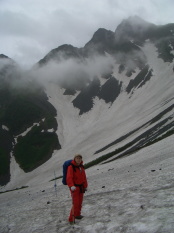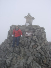 奥穂の山頂にへばりつくhosikuzu(爆) と 雪渓の上に立つhosikuzu(*^^*ゞ